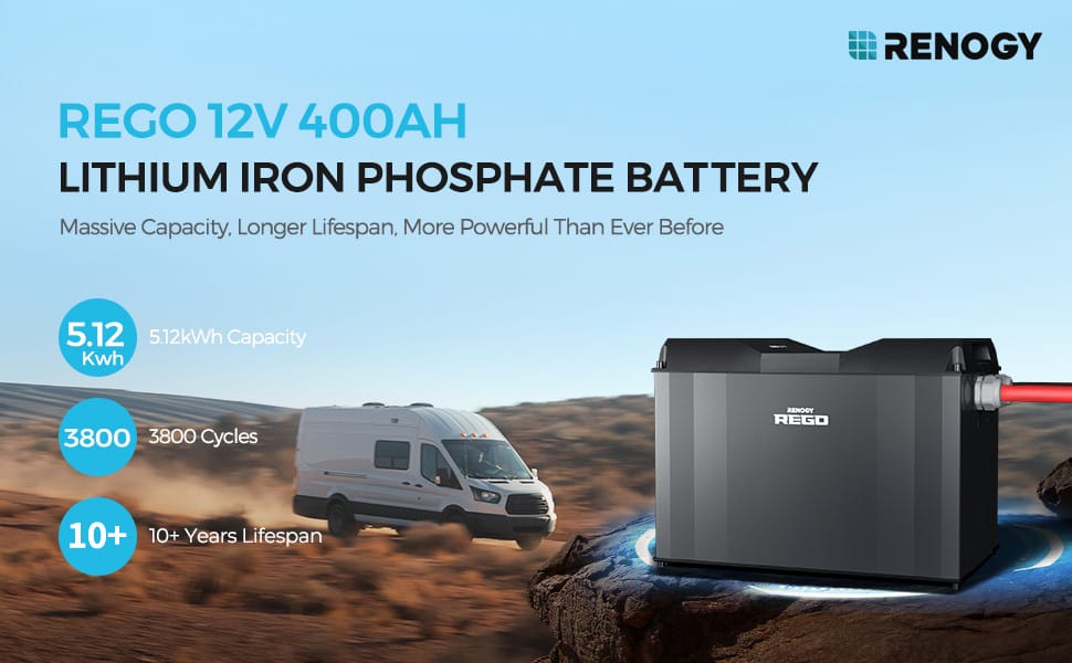 Time to meet the latest Renogy REGO 12V 400A Lithium Iron Phosphate Battery, 5.12kWh massive capacity able for expansion, providing an exceptional lifespan of more than 3800 cycles. Extruded aluminum housing offers distinctive combinations of mechanical properties and higher strength with better heat conductivity. The unprecedented BMS provides over 60 types of full protections and ensures ultra safety. With built-in intelligent self-heating, keep the stable charging even in colder conditions.