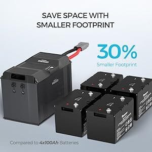 Replacing four pieces of 12V 100A lithium batteries with one REGO 12V 400A lithium battery, not only provides you 5.12kWh massive storage capacity but will also save you more than 30% of the installation footprint.